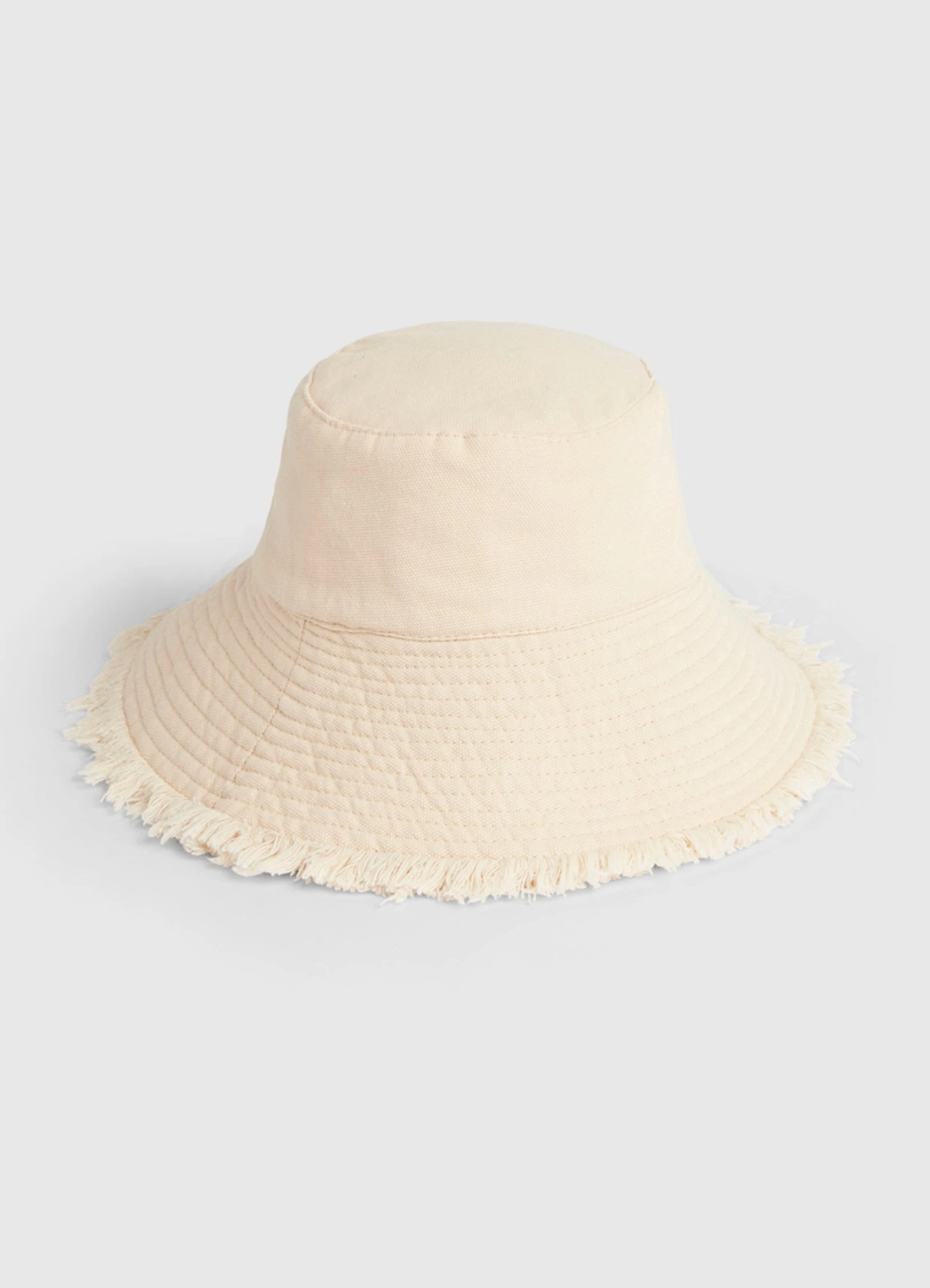 - Bucket hat style with fringe edging